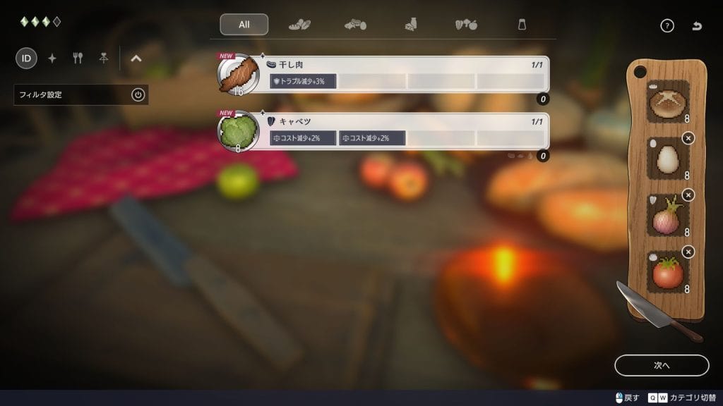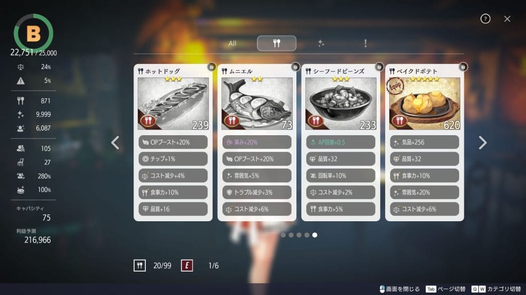 高いステータスの料理が開発できれば、酒場の収益も大きくなるので良いものを作りましょう
