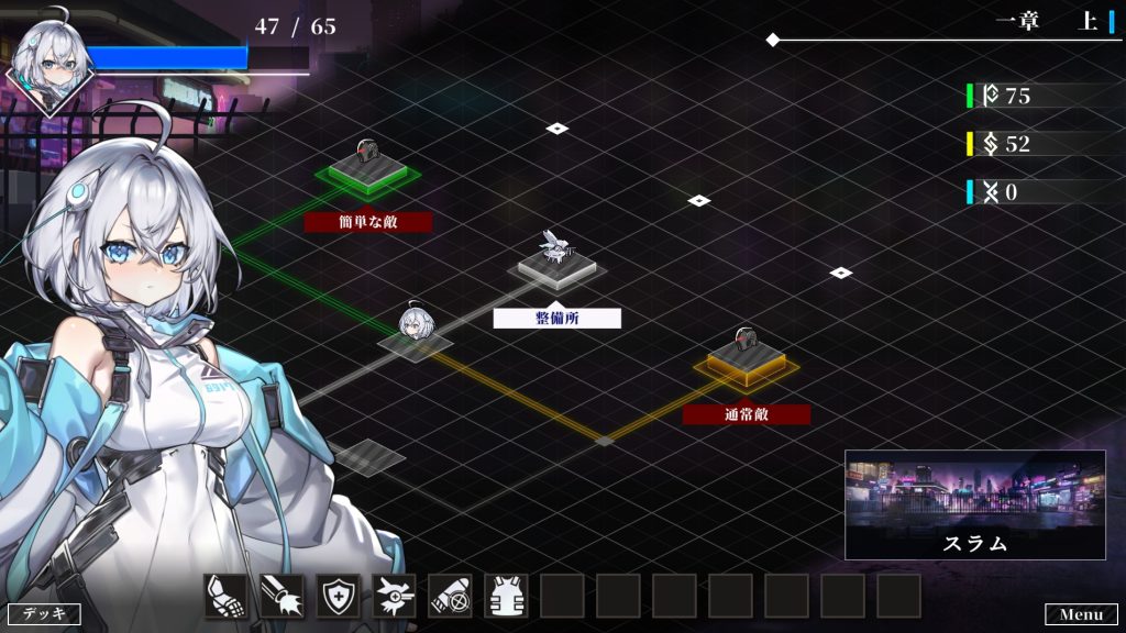 ミッション終了後は次ミッションに備えて、デッキ構築やカード強化・購入などができる。