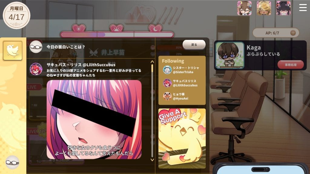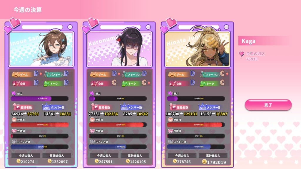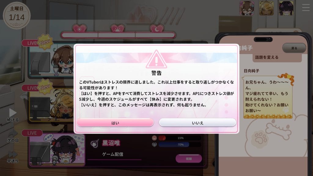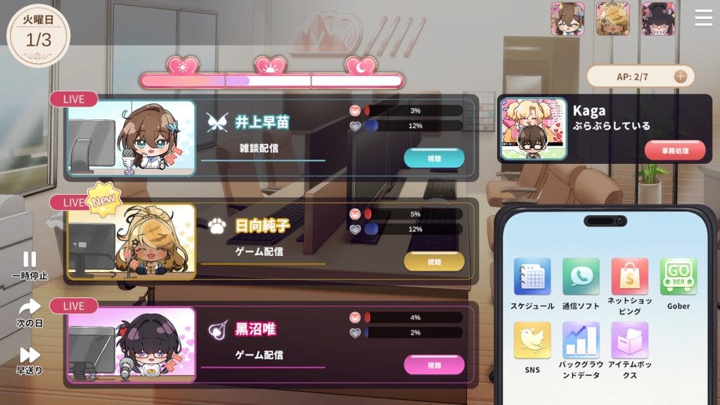 配信は登録者数や所持金が増えるがストレスも上がる。